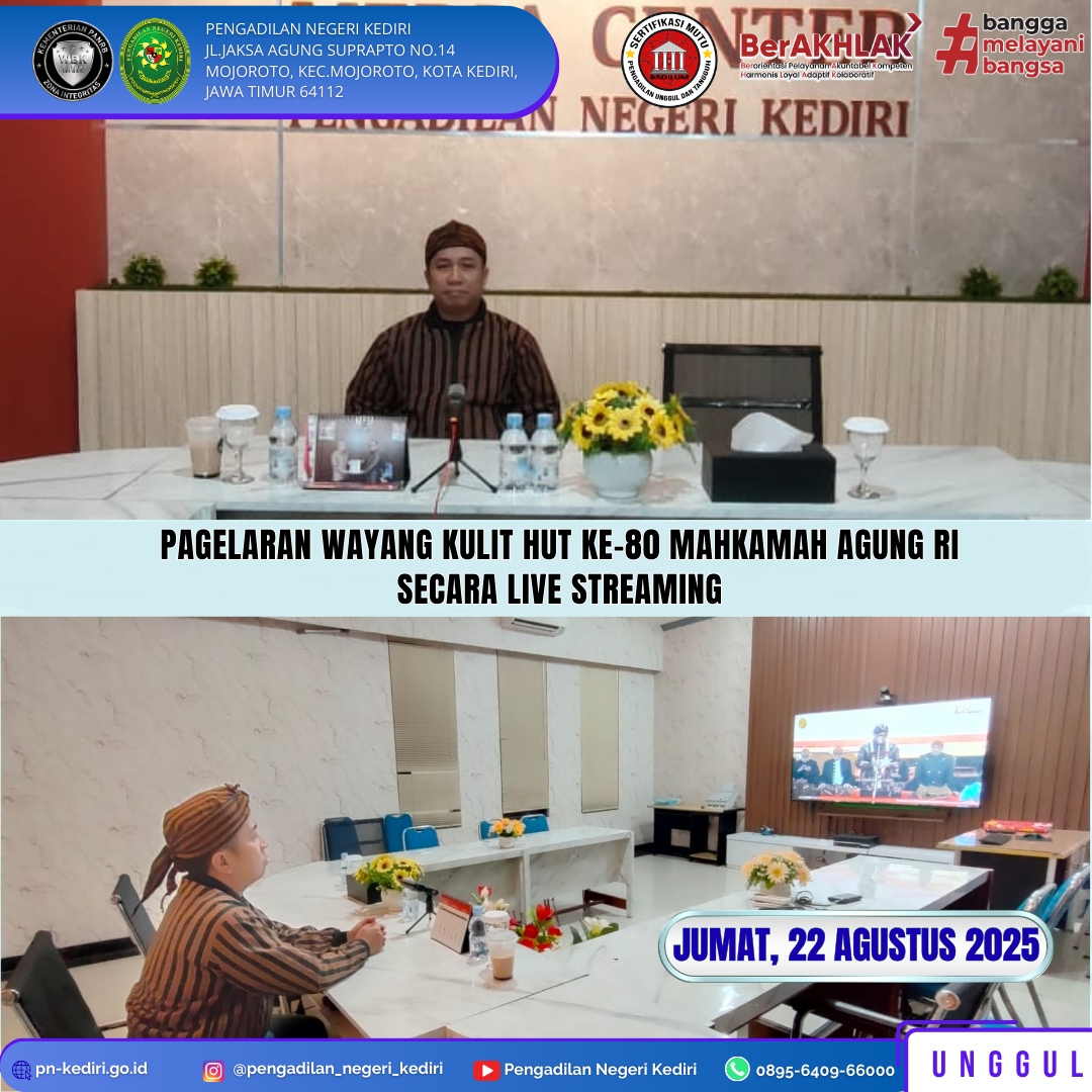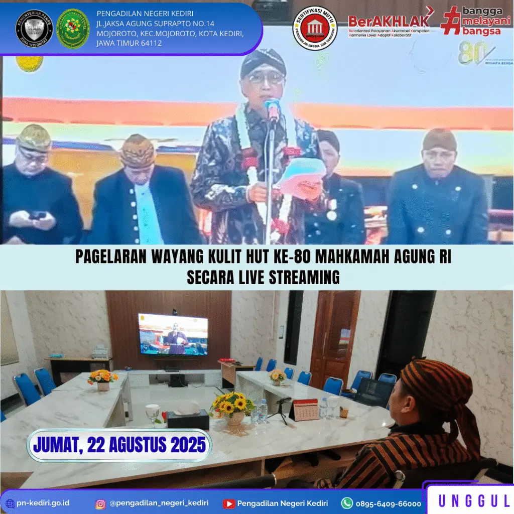 Keluarga Besar Pengadilan Negeri Kediri menyaksikan Live Streaming Pergelaran Wayang Kulit dalam rangka Hari Ulang Tahun Mahkamah Agung RI Ke-80 dengan Lakon Banjaran Kokrosono di Halaman Parkir Barat Gedung Mahkamah Agung RI pada Hari Jum’at, tanggal 22 Agustus 2025 melalui kanal Youtube Mahkamah Agung RI.