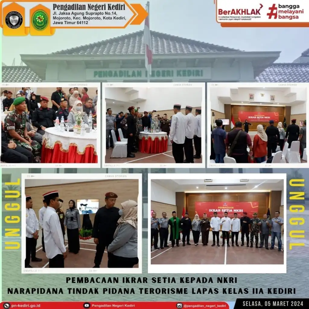 Ketua Pengadilan Negeri Kediri, Ibu Maulia Martwenty Ine, S.H., M.H. menghadiri Acara Pembacaan Ikrar Setia kepada NKRI Narapidana Tindak Pidana Terorisme Lapas Kelas IIA Kediri.
