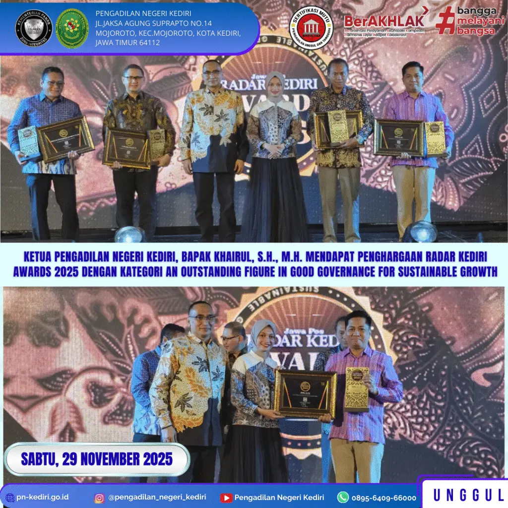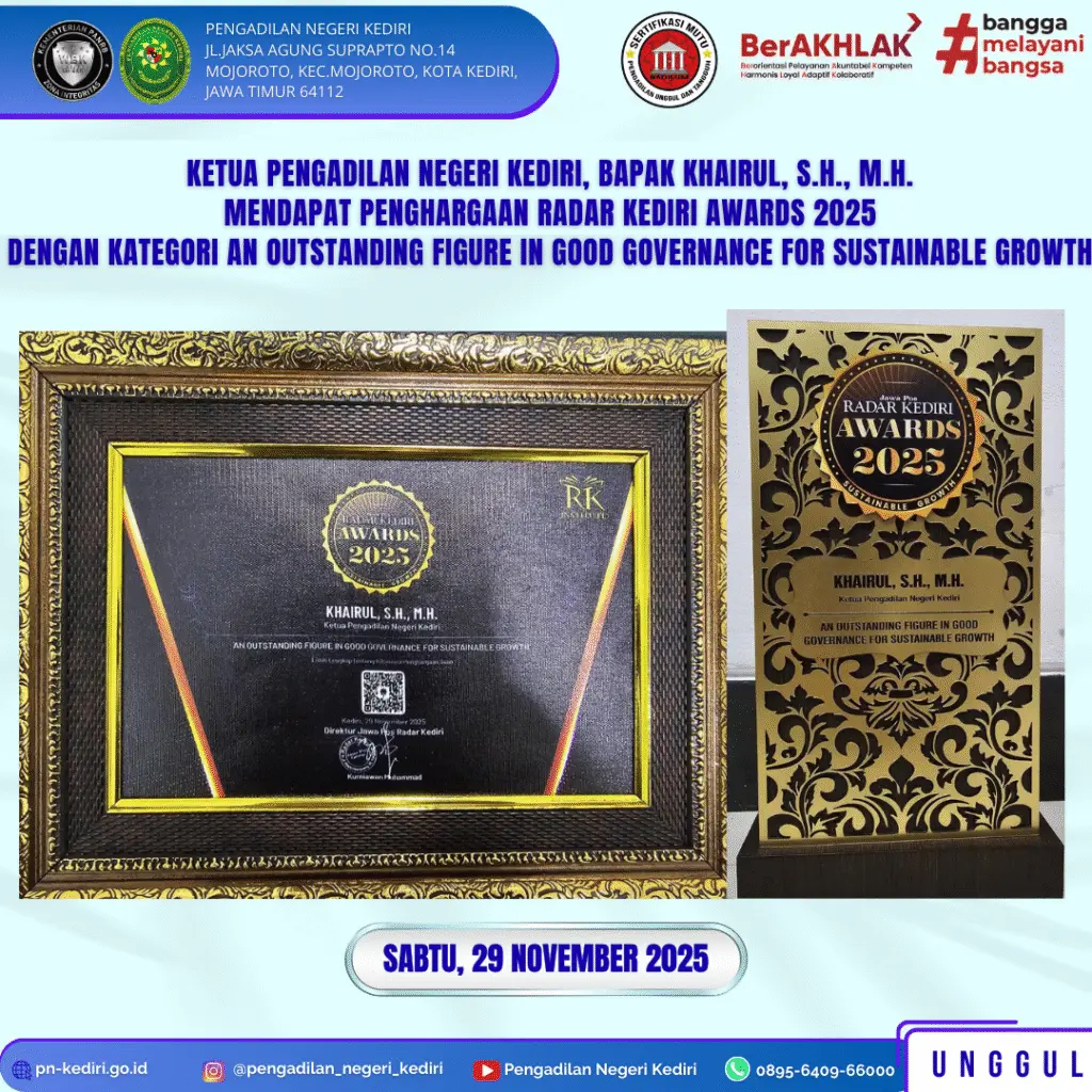 Ketua Pengadilan Negeri Kediri, Bapak Khairul, S.H., M.H. berhasil meraih penghargaan dalam ajang Radar Kediri Awards 2025. Dalam acara penganugerahan yang digelar pada Sabtu, tanggal 29 November 2025, bertempat di Tegowangi Room Grand Surya Hotel Kota Kediri, beliau dinobatkan sebagai “An Outstanding Figure in Good Governance for Sustainable Growth”, sebuah kategori yang diberikan kepada tokoh yang dinilai mampu menghadirkan tata kelola lembaga yang profesional, transparan, dan berorientasi pada keberlanjutan.