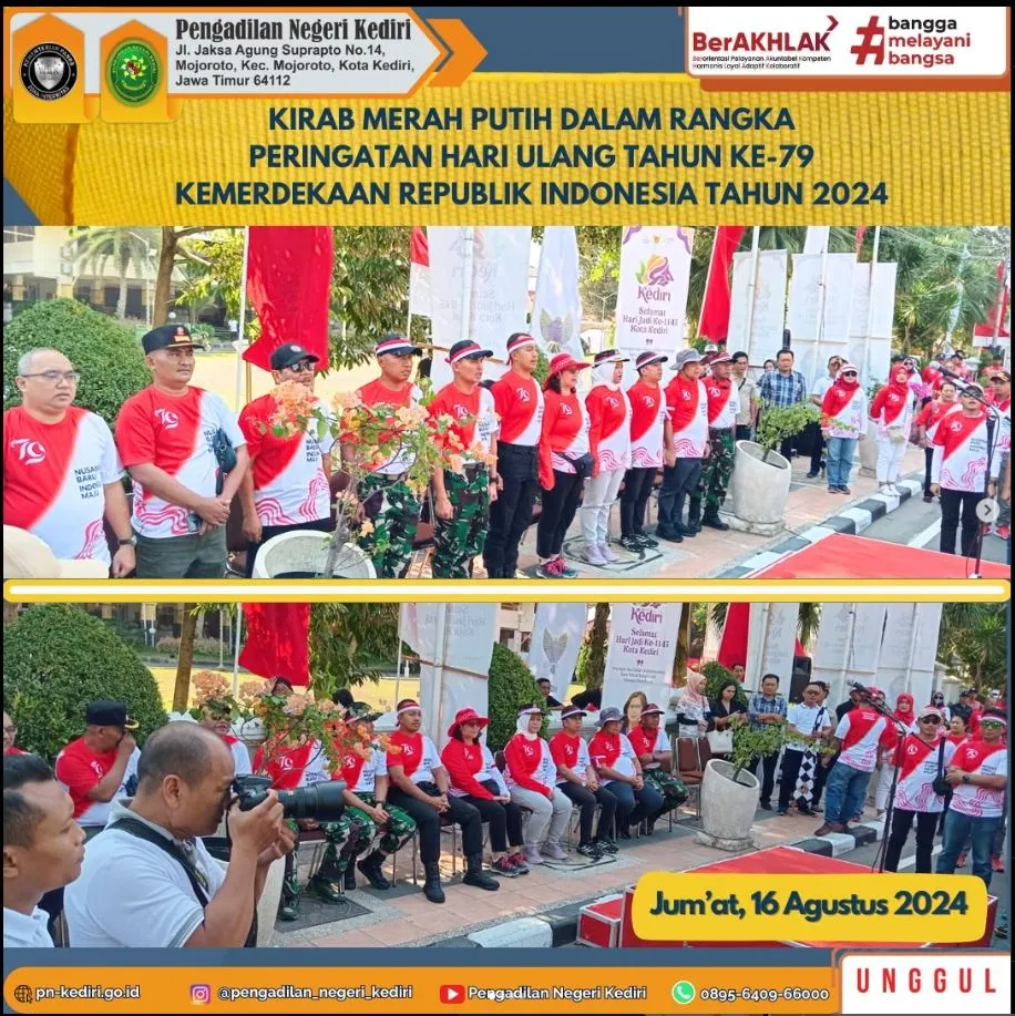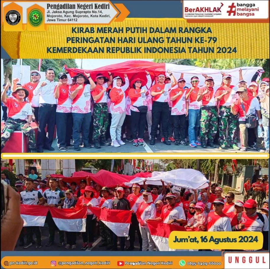 Ketua Pengadilan Negeri Kediri, Bapak Khairul, S.H., M.H. mengikuti kegiatan Kirab Merah Putih dalam rangka peringatan Hari Ulang Tahun ke-79 Kemerdekaan Republik Indonesia Tahun 2024 pada Hari Jum’at, tanggal 16 Agustus 2024 dengan route start depan Balai Kota Kediri dan finish Disbudparpora Kota Kediri.