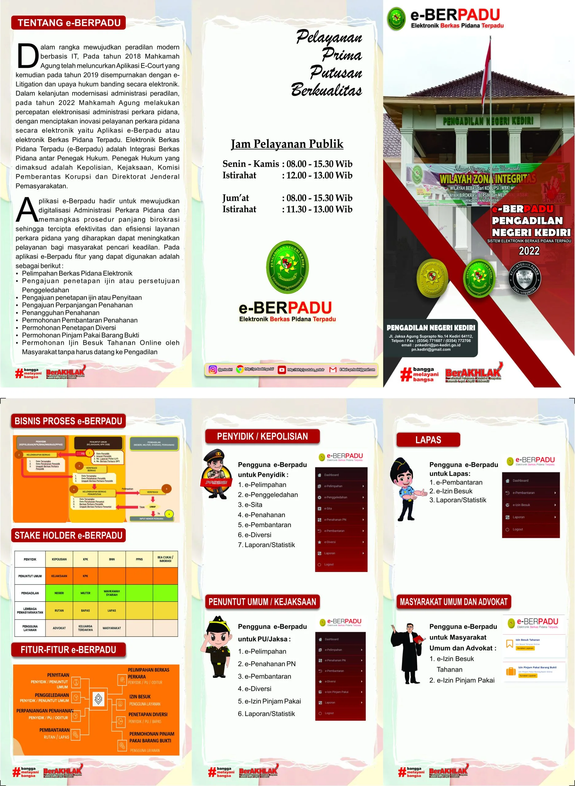 e-BERPADU (Elektronik Berkas Pidana Terpadu) adalah aplikasi berbasis web yang terintegrasi yang dipergunakan untuk pengolahan dan pertukaran dokumen administrasi perkara pidana, antara lain: pelimpahan berkas perkara pidana secara elektronik, permohonan izin/persetujuan penyitaan secara elektronik, permohonan izin/persetujuan pengeledahan secara elektronik, perpanjangan penahanan secara elektronik, permohonan izin pembantaran, permohonan izin besuk secara elektronik, penetapan diversi, permohonan izin pinjam pakai barang bukti dan sebagainya. Aplikasi ini akan terus dikembangkan sesuai dengan kebutuhan. Aplikasi e-Berpadu diharapkan dapat mendorong perwujudan Sistem Basis Data Penanganan Perkara Tindak Pidana Secara Terpadu Berbasis Teknologi Informasi. eBerpadu merupakan “embrio” perwujudan Sistem Peradilan Pidana Secara Elektronik atau yang dikenal dengan e-Court Pidana, sebagaimana telah diamanatkan dalam Peraturan Mahkamah Agung Nomor 4 Tahun 2020. Mahkamah Agung mengharapkan kebijakan ini akan menjadi perubahan proses menuju Sistem Pemerintahan Berbasis Elektronik (SPBE).