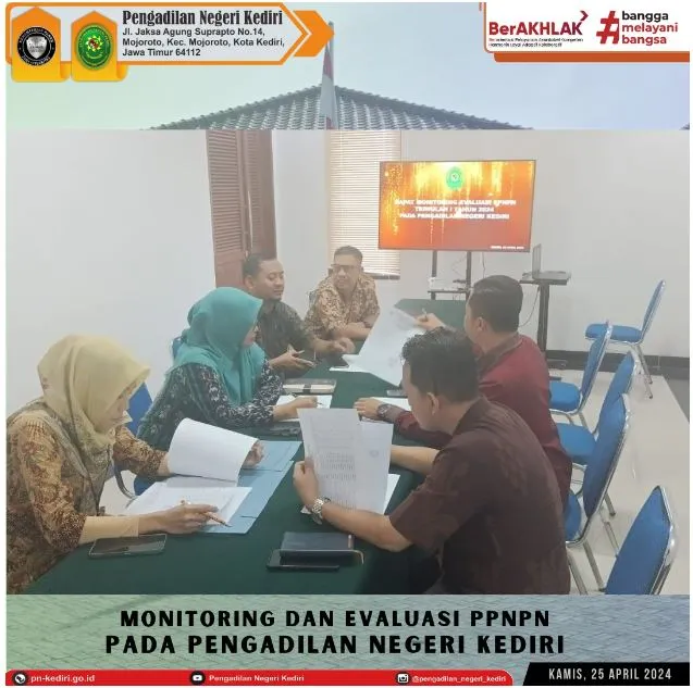 Berdasarkan Surat Keputusan Ketua Pengadilan Negeri Kediri Nomor : 132/KPN.W14-U4/SK.KP7.1/I/2024, tentang Tim Monitoring dan Evaluasi Pegawai Pemerintah Non Pegawai Negeri Tahun Anggaran 2024 pada Pengadilan Negeri Kediri, Tim Evaluasi melaksanakan kegiatan Evaluasi Pegawai Pemerintah Non Pegawai Negeri (PPNPN) Triwulan I Tahun Anggaran 2024. Kegiatan Evaluasi ini dilaksanakan pada hari Kamis, tanggal 25 April 2024, bertempat di Ruang Rapat I Pengadilan Negeri Kediri.