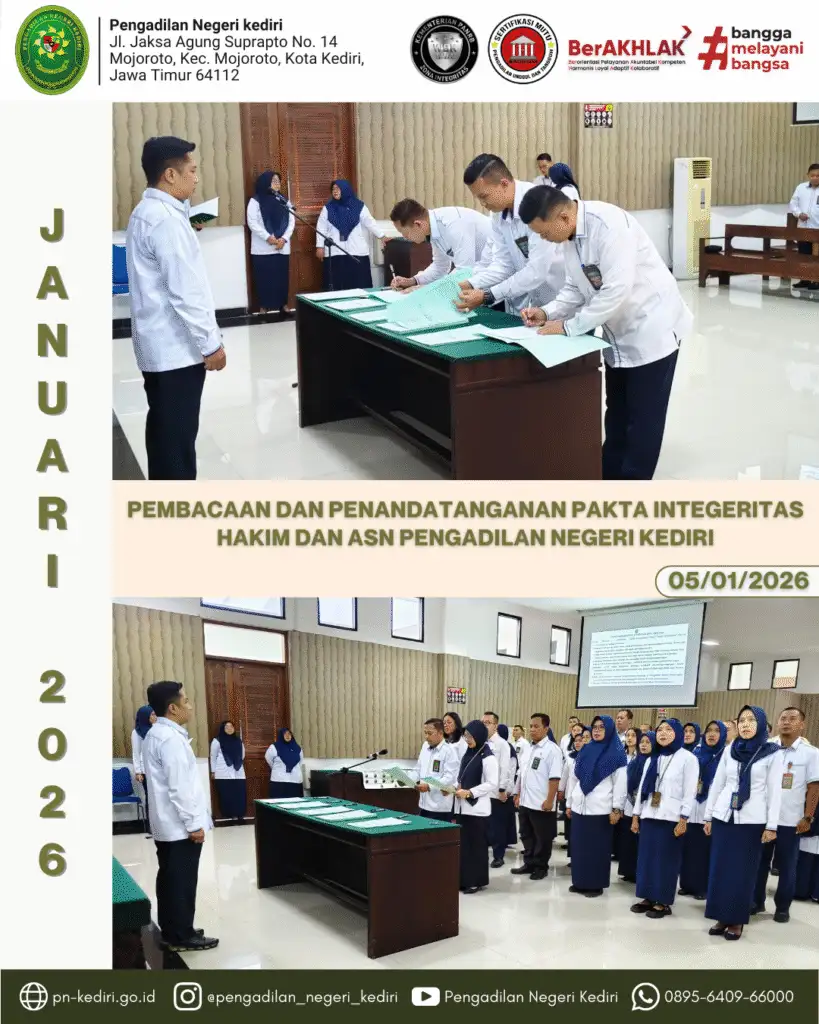 Mengawali hari kerja pertama di tahun 2026, Pengadilan Negeri Kediri menggelar pembacaan dan penandatanganan Pakta Integritas di Ruang Sidang Cakra pada Senin pagi (05/01). Seluruh pimpinan, hakim, dan aparatur hadir dalam suasana khidmat sebagai bentuk pembaruan komitmen integritas dan profesionalisme dalam menjalankan tugas sebagai abdi hukum.