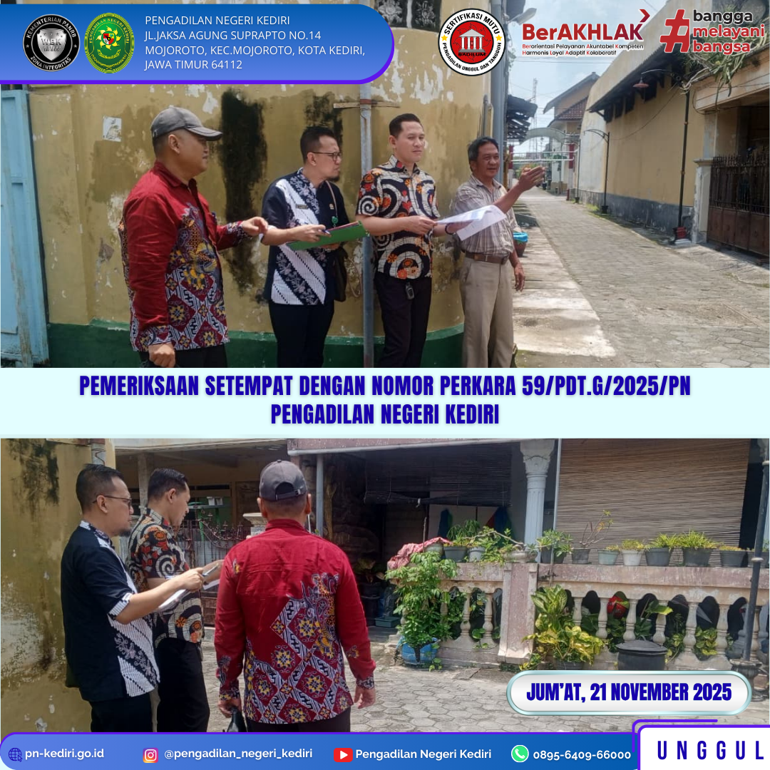 Majelis Hakim Pengadilan Negeri Kediri dalam Perkara Nomor 59/Pdt.G/2025/PN Kdr melaksanakan kegiatan Pemeriksaan Setempat terhadap objek sengketa berupa sebuah rumah dan bangunan.Pemeriksaan setempat dilaksanakan pada Tanggal 21 November 2025 sesuai penjadwalan persidangan yang telah ditetapkan.Objek pemeriksaan berlokasi di Jalan Kenanga I, Perumnas Ngronggo, Kelurahan Ngronggo, Kecamatan Kota, Kota Kediri.