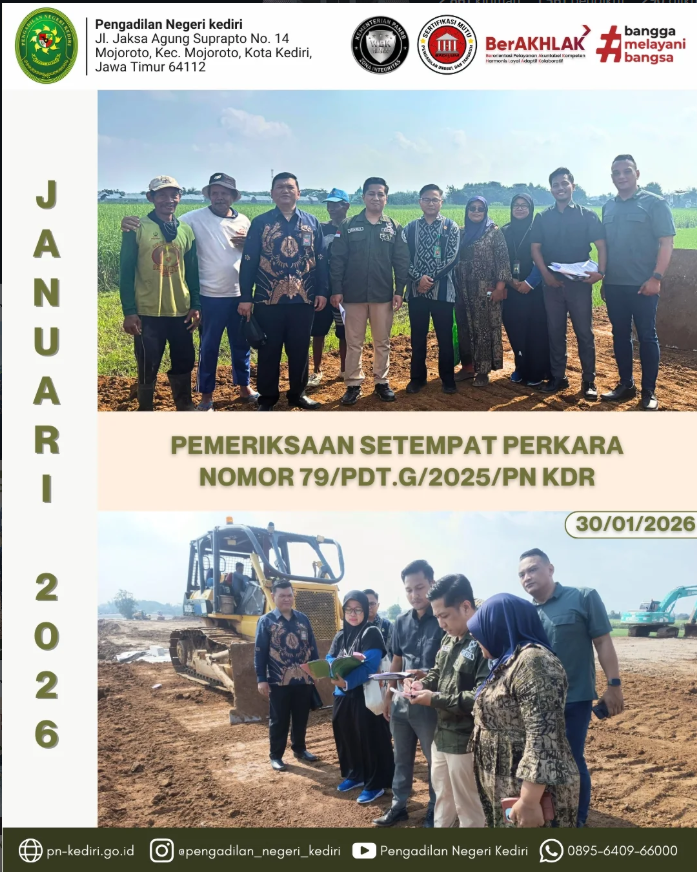 Pengadilan Negeri Kediri melaksanakan kegiatan peninjauan lokasi perkara perdata Nomor 79/Pdt.G/2025/PN Kdr sebagai bagian dari rangkaian proses pemeriksaan perkara guna memperoleh kejelasan dan kepastian mengenai objek sengketa. Kegiatan peninjauan lokasi tersebut dilaksanakan oleh Majelis Hakim yang memeriksa perkara, dengan dihadiri para pihak berperkara atau kuasanya, serta didampingi oleh Panitera Pengganti. Peninjauan lokasi ini bertujuan untuk mencocokkan fakta-fakta hukum yang terungkap di persidangan dengan kondisi faktual di lapangan, sehingga dapat memberikan gambaran yang utuh dan objektif bagi Majelis Hakim dalam menilai dan mempertimbangkan perkara yang sedang diperiksa. Seluruh rangkaian kegiatan peninjauan lokasi dilaksanakan secara tertib, transparan, dan sesuai dengan ketentuan hukum acara perdata yang berlaku.
