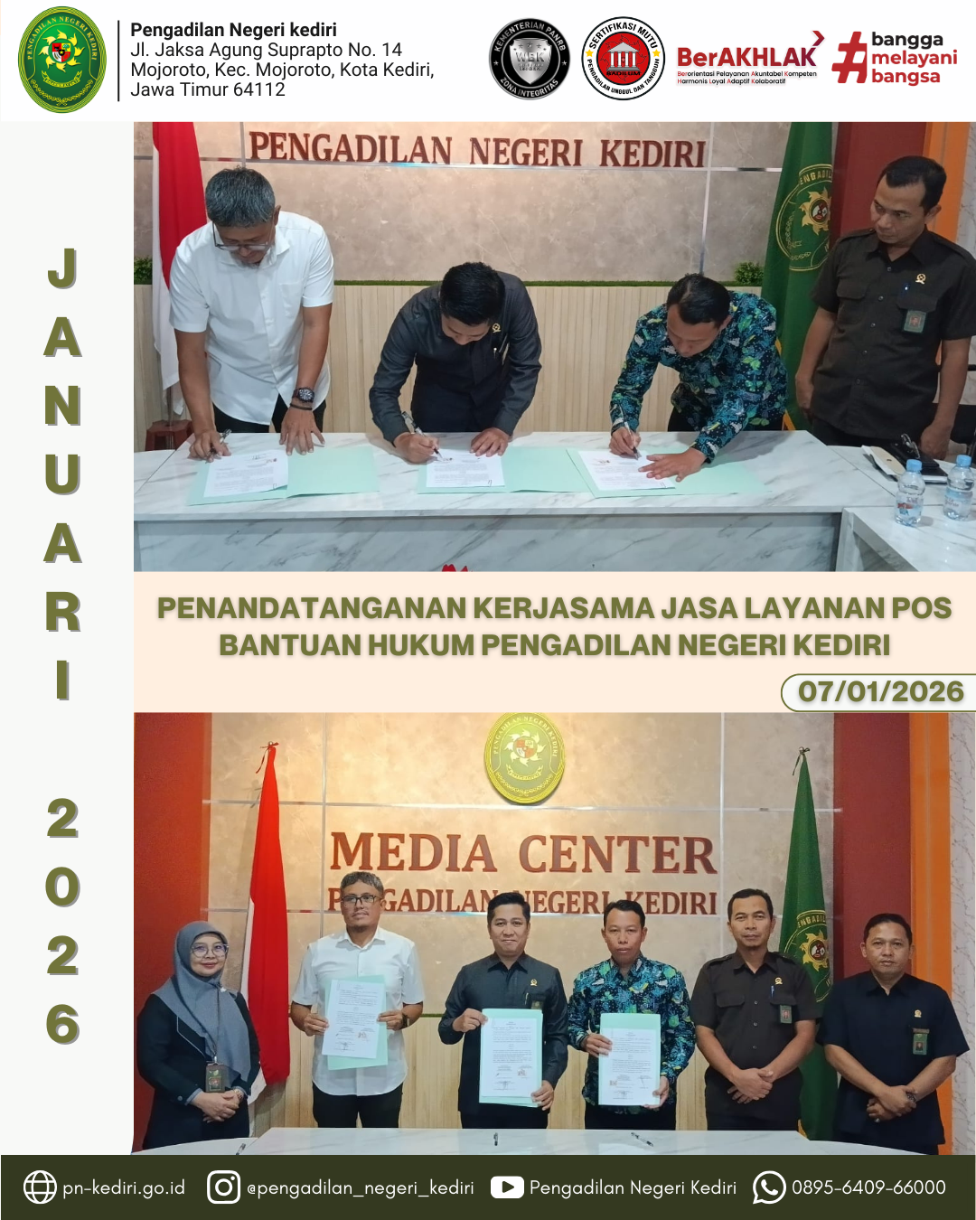 Pengadilan Negeri Kediri menyelenggarakan kegiatan Penandatanganan Kerjasama Jasa Layanan Pos Bantuan Hukum (POSBAKUM) antara Badan Konsultasi dan Bantuan Hukum (BKBH) Universitas Islam Kadiri (UNISKA) dan Lembaga Bantuan Hukum (LBH) Al Amin selaku penyedia layanan bantuan hukum bagi masyarakat pencari keadilan. Kegiatan ini bertempat di Ruang Media Center Pengadilan Negeri Kediri.