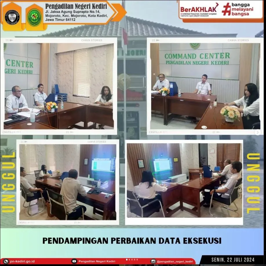 Pengadilan Negeri Kediri mengikuti kegiatan pendampingan perbaikan data eksekusi secara daring, pada Hari Senin, tanggal 22 Juli 2024, bertempat diruang Command Center Pengaidlan Negeri Kediri. Diikuti oleh Panitera, Panitera Muda Perdata dan Admin SIPP Pengadilan Negeri Kediri.
