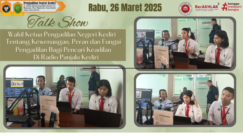 Pengadilan Negeri Kediri melakukan kegiatan Talk Show di Radio Panjalu Kediri, dengan Narasumber Wakil Ketua Pengadilan Negeri Kediri, Bapak Bayu Agung Kurniawan, S.H., dan Calon Hakim Pengadilan Negeri Kediri, Ibu Melva Christien Manurung, S.H., Bapak Fachrian Rizki, S.H. pada Hari Rabu, tanggal 26 Maret 2025.