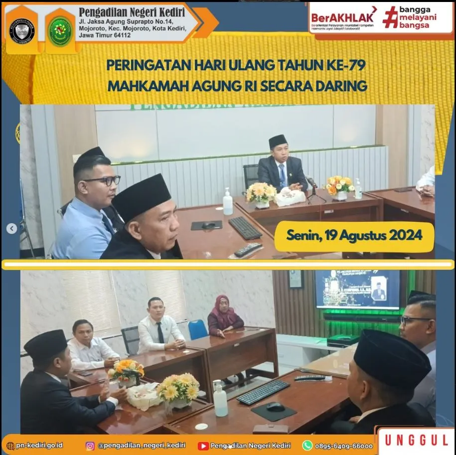 Pengadilan Negeri Kediri mengikuti Acara Peringatan Hari Ulang Tahun Ke-79 Mahkamah Agung Republik Indonesia secara daring, pada Hari Senin, Taggal 19 Agustus 2024, di Ruang Command Center Pengadilan Negeri Kediri.