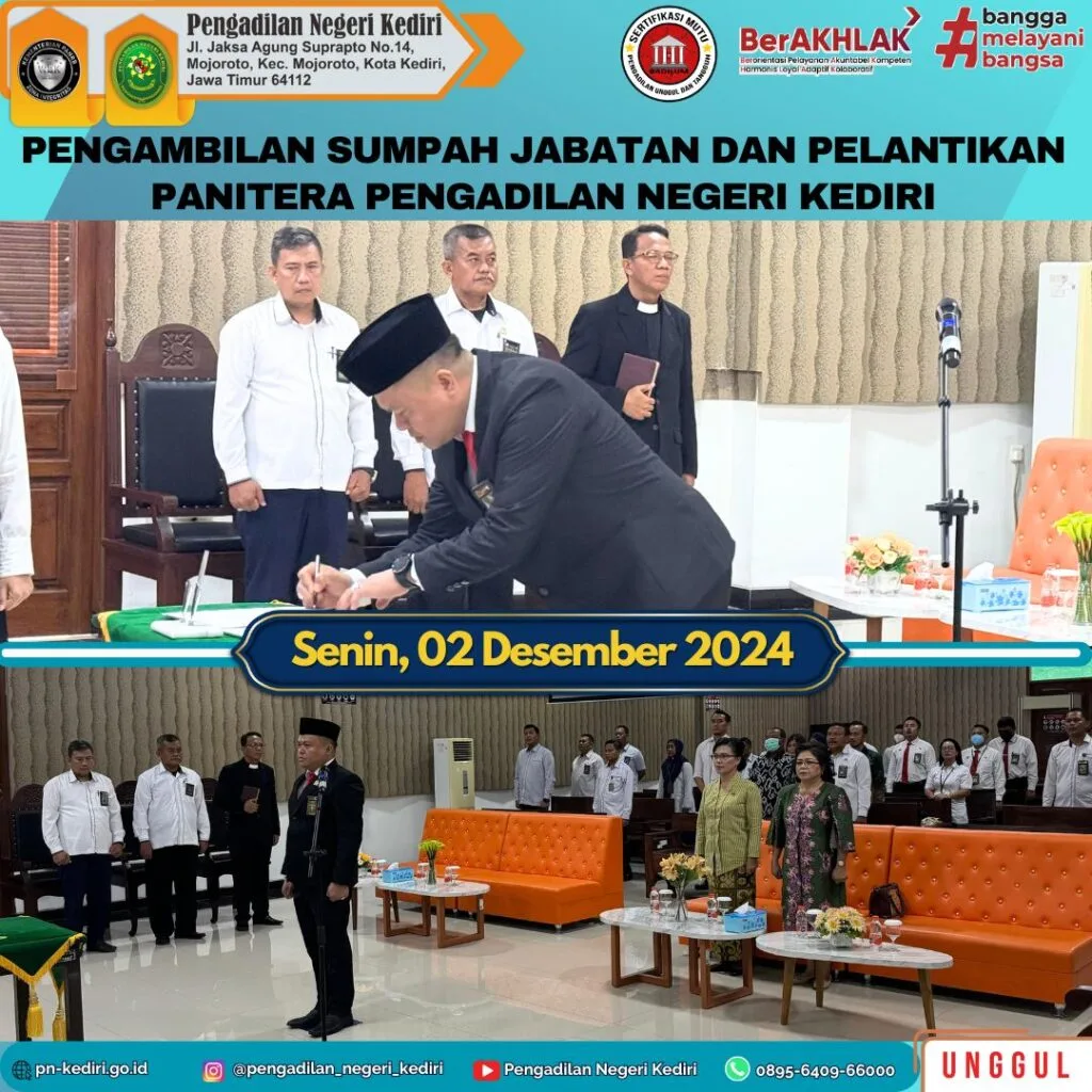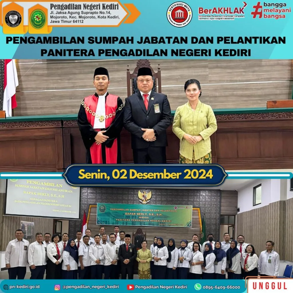 Pengambilan Sumpah Jabatan dan Pelantikan Bapak Berly, S.E., S.H., Panitera Pengadilan Negeri Kediri oleh Bapak Bayu Agung Kurniawan, S.H., Wakil Ketua Pengadilan Negeri Kediri pada Hari Senin, tanggal 2 Desember 2024, bertempat di Ruang Sidang Cakra Pengadilan Negeri Kediri.