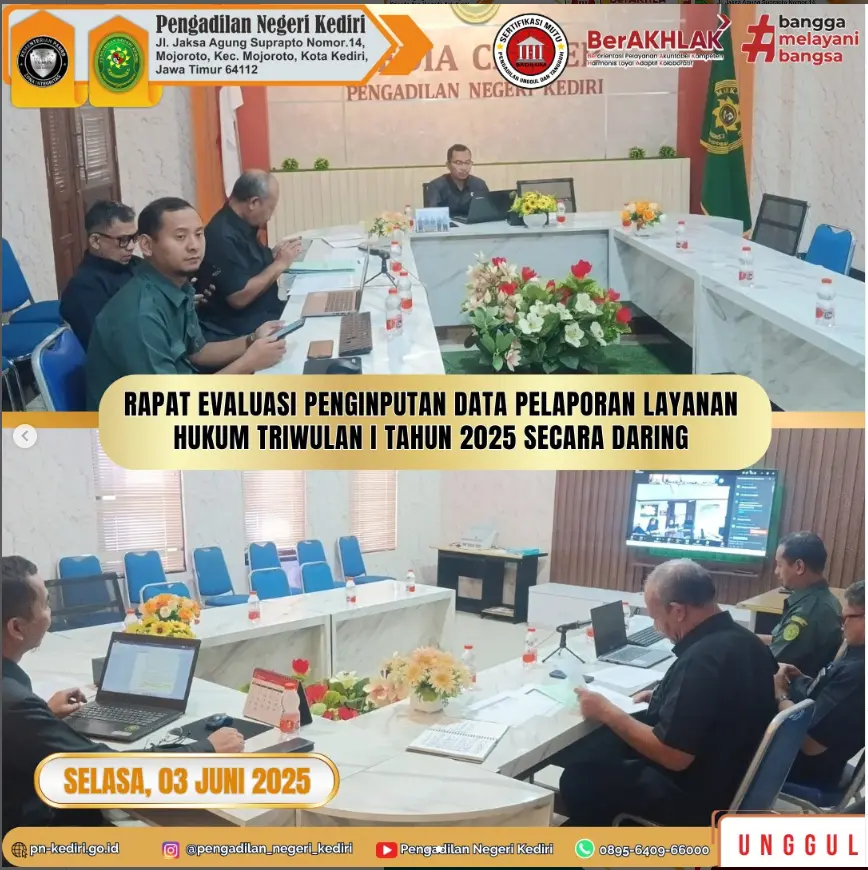 Wakil Ketua Pengadilan Negeri Kediri, Bapak Bayu Agung Kurniawan, S.H. beserta Sekretaris, Plh Panitera dan Operator Pelaporan Elektronik Pengadilan Negeri Kediri mengikuti Rapat Evaluasi Penginputan Data Pelaporan Layanan Hukum Triwulan I tahun 2025 secara daring pada Hari Selasa, tanggal 3 Juni 2025, di Ruang Media Center Pengadilan Negeri Kediri.