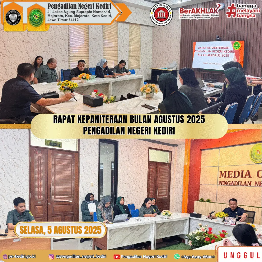 Kegiatan Rapat Kepaniteraan Bulan Agustus 2025 dilaksanakan pada hari Selasa, 5 Agustus 2025 bertempat di Ruang Media Center Pengadilan Negeri Kediri, dipimpin oleh Panitera Pengadilan Negeri Kediri, Bapak Berly, S.E., S.H., dan dihadiri oleh seluruh Panitera Muda, Panitera Pengganti, Jurusita dan Staff Kepaniteraan Pengadilan Negeri Kediri.