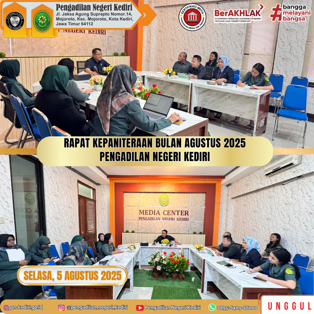 Kegiatan Rapat Kepaniteraan Bulan Agustus 2025 dilaksanakan pada hari Selasa, 5 Agustus 2025 bertempat di Ruang Media Center Pengadilan Negeri Kediri, dipimpin oleh Panitera Pengadilan Negeri Kediri, Bapak Berly, S.E., S.H., dan dihadiri oleh seluruh Panitera Muda, Panitera Pengganti, Jurusita dan Staff Kepaniteraan Pengadilan Negeri Kediri.