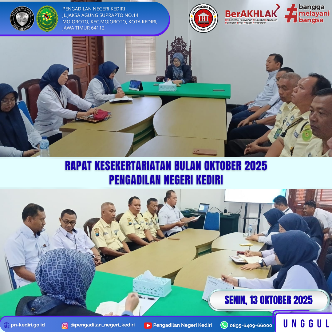 Kegiatan Rapat Kesekretariatan pada Hari Senin, tanggal 13 Oktober 2025, di Ruang Media Center Pengadilan Negeri Kediri.