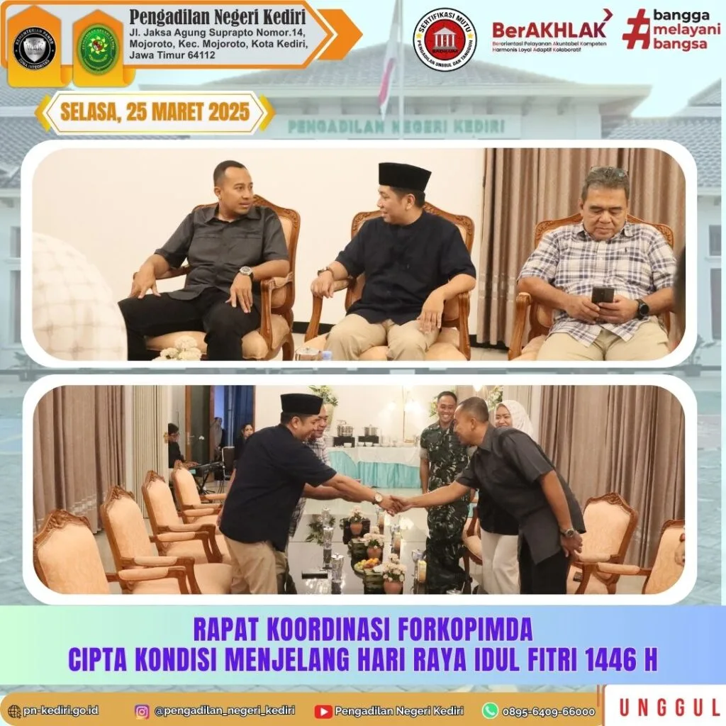 Ketua Pengadilan Negeri Kediri, Bapak Khairul, S.H., M.H. menghadiri Rapat Koordinasi FORKOPIMDA Cipta Kondisi Menjelang Hari Raya Idul Fitri 1446 H pada Hari Selasa, 25 Maret 2025 di Rumah Dinas Walikota Kediri.
