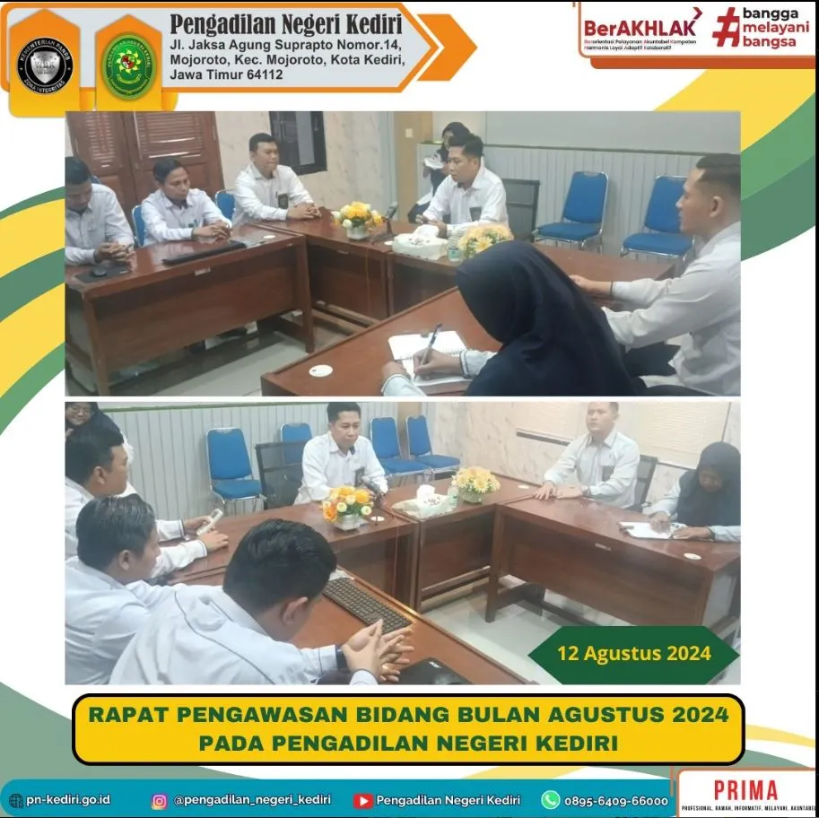 Pengadilan Negeri Kediri melaksanakan Rapat Pengawasan Bidang pada Hari Senin, tanggal 12 Agustus 2024, bertempat di Ruang Command Center Pengadilan Negeri Kediri.