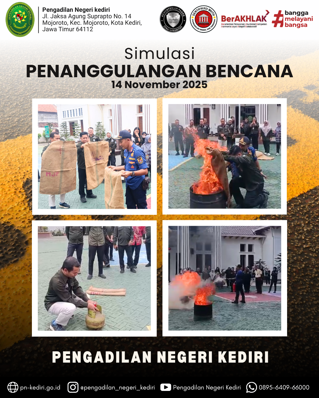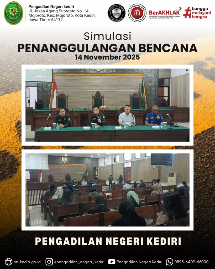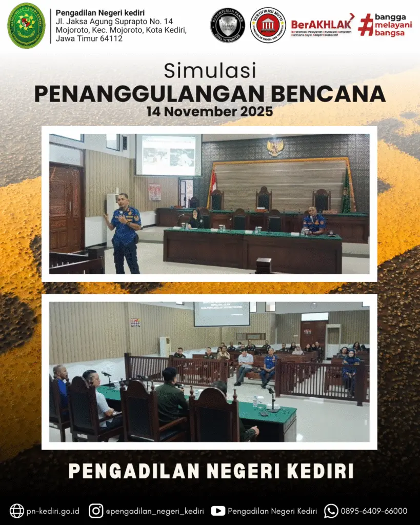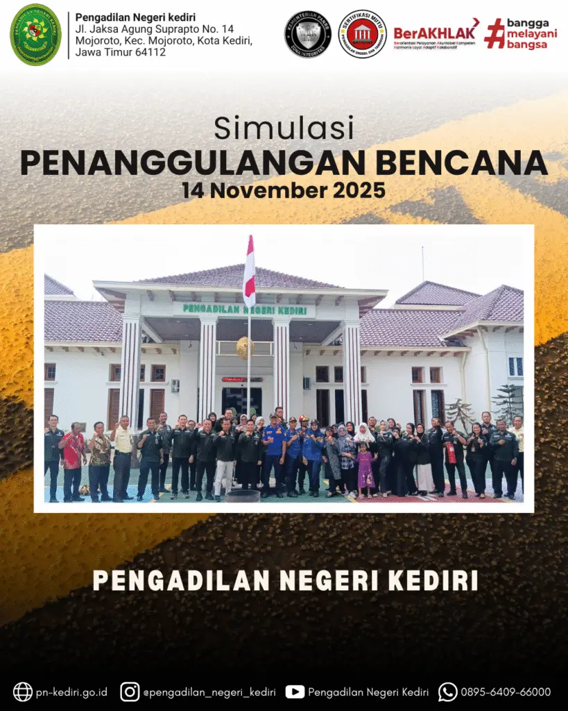 Pengadilan Negeri Kediri melaksanakan kegiatan Simulasi Penanganan Bencana Alam pada hari Jum’at, tanggal 14 November 2025 bertempat di halaman kantor Pengadilan Negeri Kediri. Kegiatan ini digelar sebagai upaya meningkatkan kesiapsiagaan aparatur dalam menghadapi potensi keadaan darurat serta membangun budaya tanggap bencana di lingkungan satuan kerja.