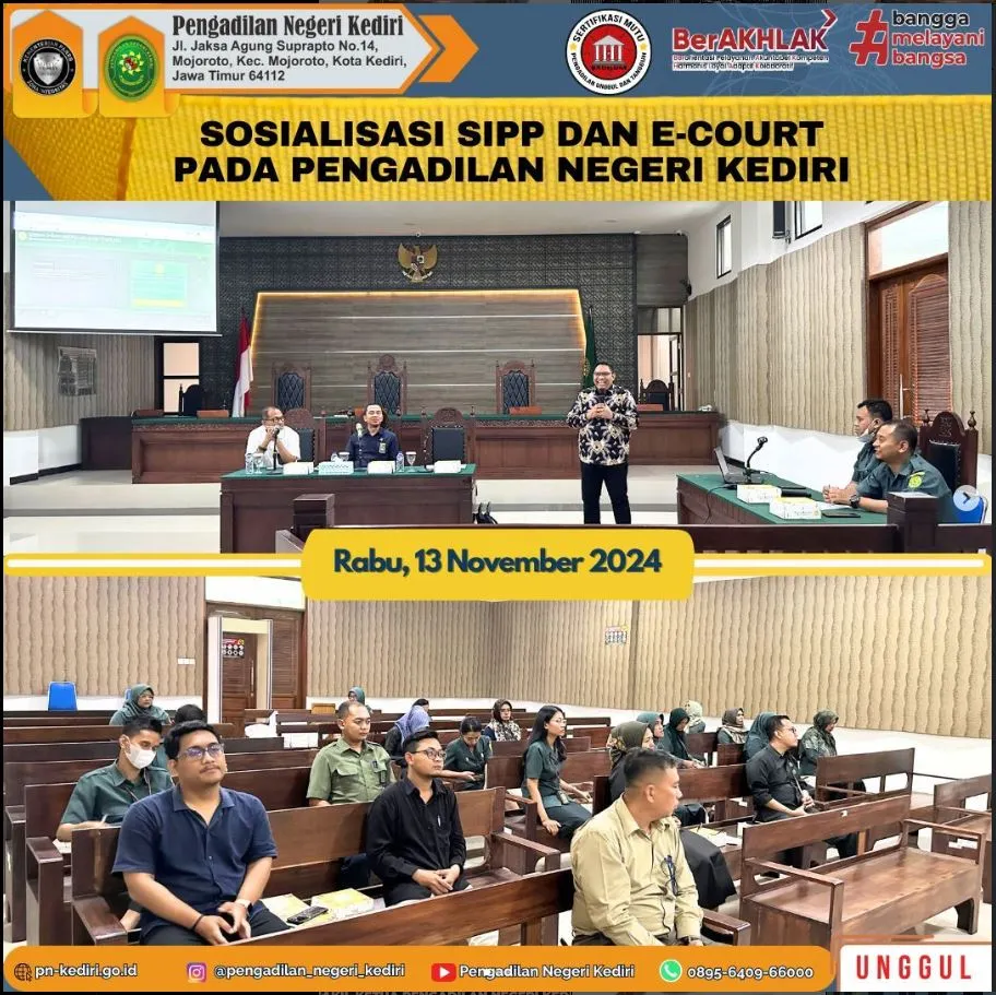 Pada Hari ini Rabu, tanggal 13 November 2024, bertempat di Ruang Sidang Cakra Pengadilan Negeri telah dilaksanakan Sosialisasi SIPP dan E-Court oleh Bapak Adityo Nugroho, S.T. dari Satgas SIPP Mahkamah Agung.