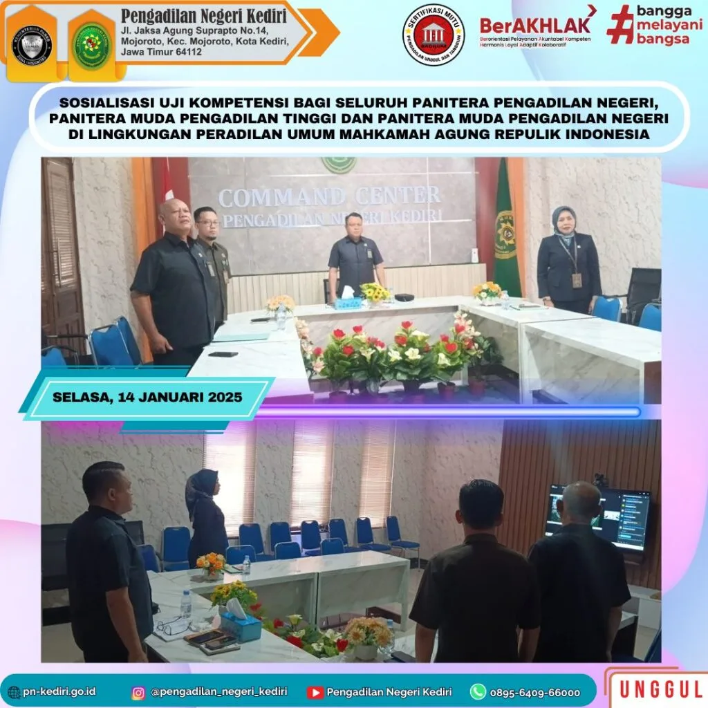 Pada hari Selasa, tanggal 14 Januari 2025, Panitera Pengadilan Negeri Kediri, Bapak Berly, S.E., S.H. beserta seluruh Panitera Muda Pengadilan Negeri Kediri mengikuti kegiatan Sosialisasi Uji Kompetensi bagi seluruh Panitera Pengadilan Negeri, Panitera Muda Pengadilan Tinggi dan Panitera Muda Pengadilan Negeri di Lingkungan Peradilan Umum Mahkamah Agung Republik Indonesia secara daring.