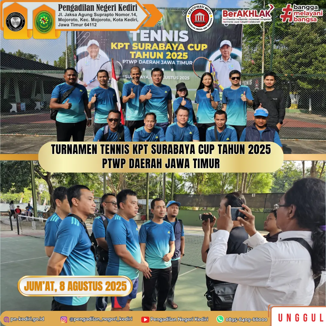 Pengadilan Negeri Kediri mengikuti Turnamen KPT Surabaya CUP II Tahun 2025 untuk Warga Pengadilan Negeri SeJawa Timur, bertempat di Lapangan Tennis Kodam V Brawijaya Surabaya.