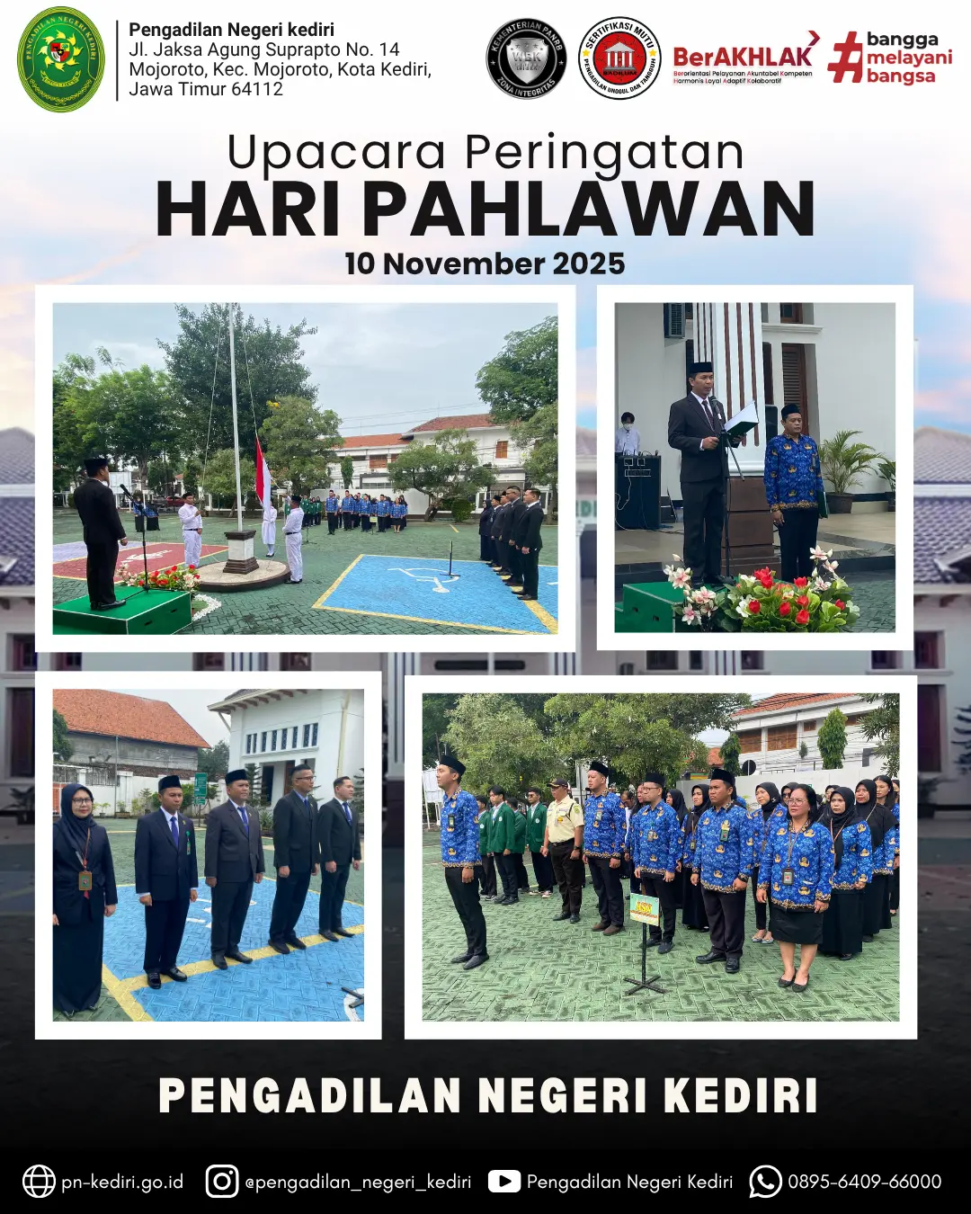 Dalam rangka memperingati Hari Pahlawan Nasional Tahun 2025, Pengadilan Negeri Kediri melaksanakan Upacara Bendera yang berlangsung dengan khidmat di halaman kantor Pengadilan Negeri Kediri, pada Hari Senin, tanggal 10 November 2025.