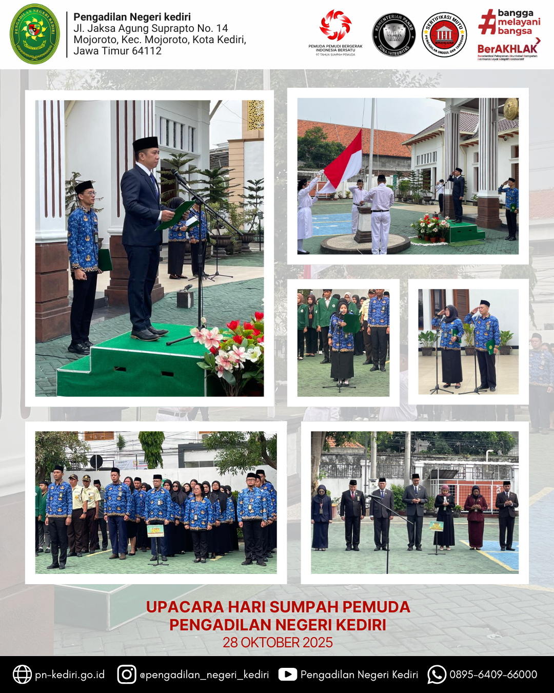 Pengadilan Negeri Kediri melaksanakan Upacara Peringatan Hari Sumpah Pemuda ke-97 Tahun 2025 pada Selasa, 28 Oktober 2025 pukul 07.30 WIB di halaman kantor Pengadilan Negeri Kediri. Kegiatan berlangsung khidmat dengan diikuti oleh seluruh aparatur pengadilan, mulai dari para hakim, pejabat struktural dan fungsional, pegawai, hingga tenaga PPPK. Tahun ini, peringatan Sumpah Pemuda mengusung tema “Pemuda Pemudi Bergerak, Indonesia Bersatu” yang menegaskan pentingnya semangat kolaborasi lintas generasi dalam membangun Indonesia yang maju dan berdaya saing.