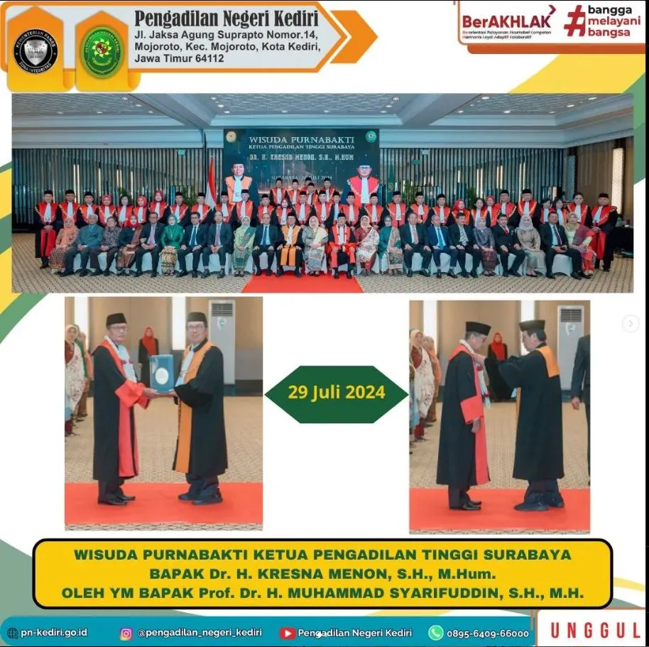 Ketua Pengadilan Negeri Kediri, Bapak Khairul, S.H., M.H. Menghadiri Wisuda Purnabakti Ketua Pengadilan Tinggi Surabaya, Bapak Dr. H. Kresna Menon, S.H., M.Hum. oleh Ym Bapak Prof. Dr. H. Muhammad Syarifuddin, S.H., M.H.bertempat di Bumi Surabaya City Resort Surabaya.
